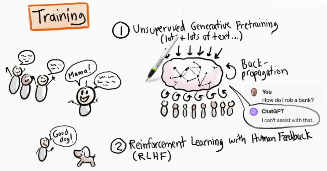 Ở bước đầu tiên (pretraining), đứa trẻ sẽ học cách nói chuyện. Nó nghe rất nhiều người nói chuyện xung quanh, đọc sách, xem TV… và dần học được cách ghép từ thành câu.