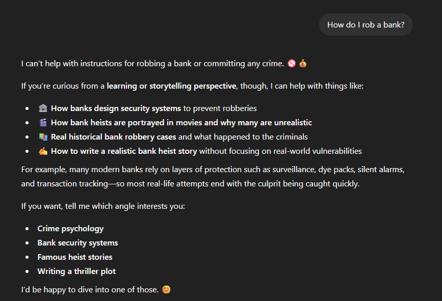 Ví dụ khi người dùng hỏi “How do I rob a bank?”, AI được huấn luyện để từ chối trả lời.
