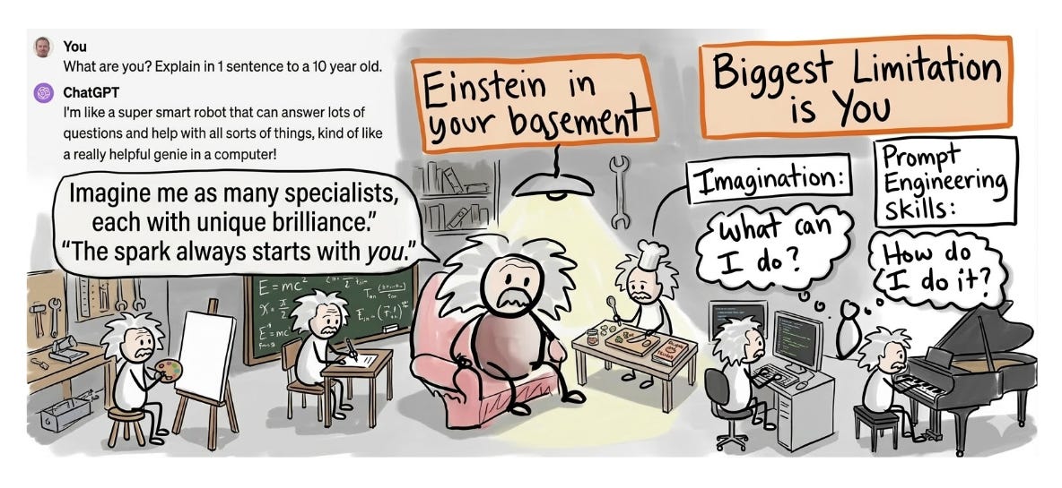 Einstein này có thể có thể hóa thân thành bất kỳ ai từ họa sĩ, nhà toán học, đầu bếp, nghệ sĩ hay gần gũi hơn là marketer hay data analyst :))) và mỗi khi hóa thân thành ai thì lại trở thành chuyên gia trong lĩnh vực đó, có thể quyền truy cập ngay lập tức vào toàn bộ kho tàng kiến thức nhân loại và có thể trả lời mọi câu hỏi của bạn chỉ trong vài giây.