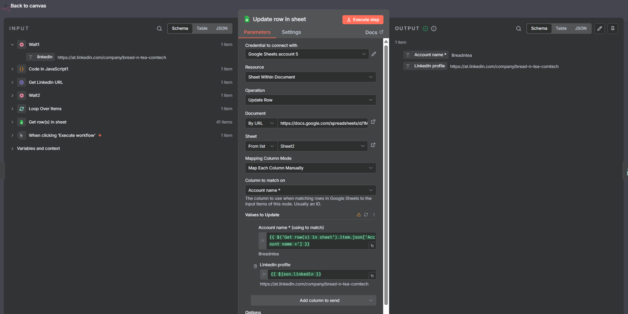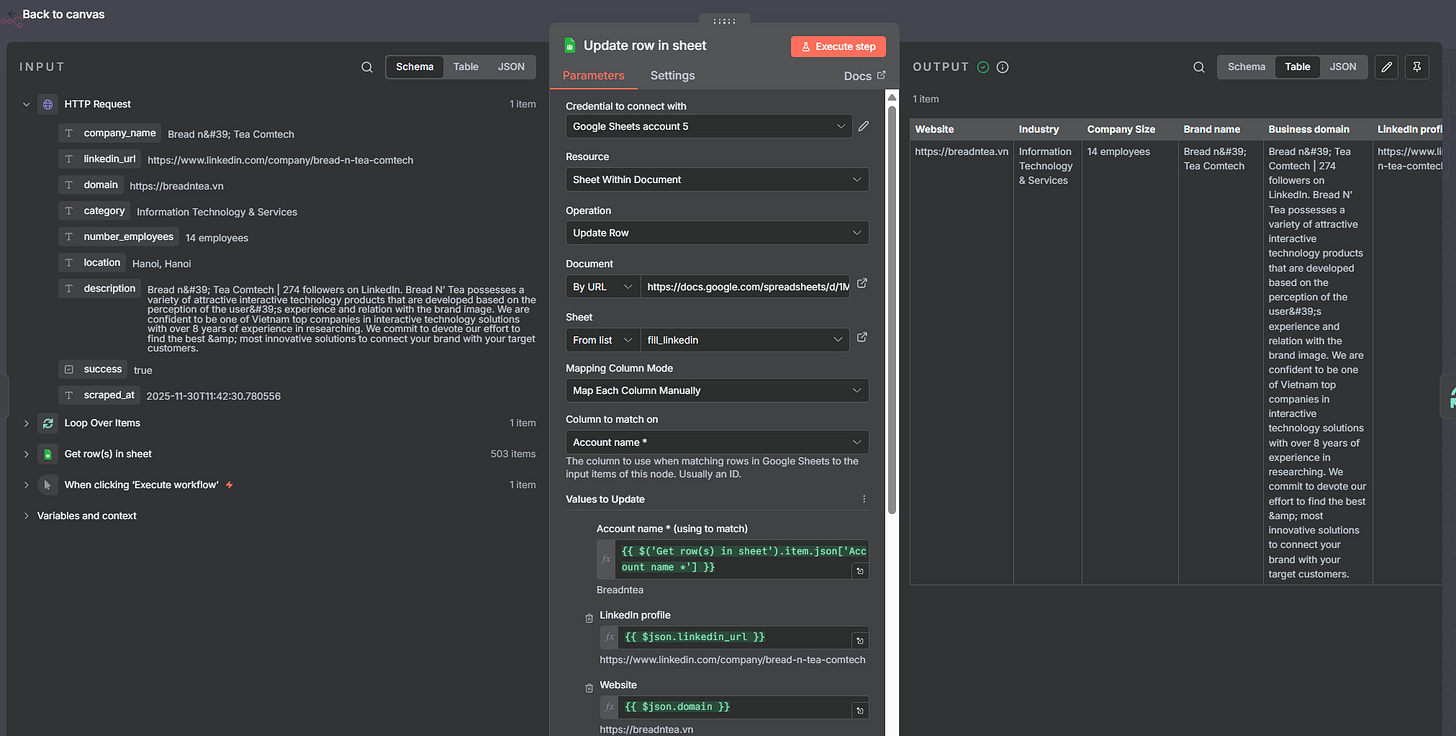 Cuối cùng, mình dùng node Update row in sheet để ghi ngược toàn bộ thông tin mới vào đúng hàng của công ty tương ứng.