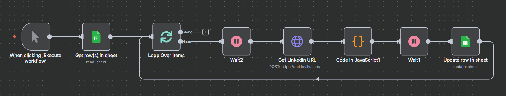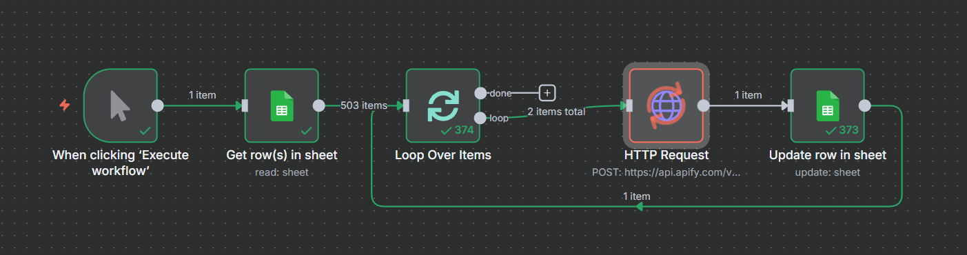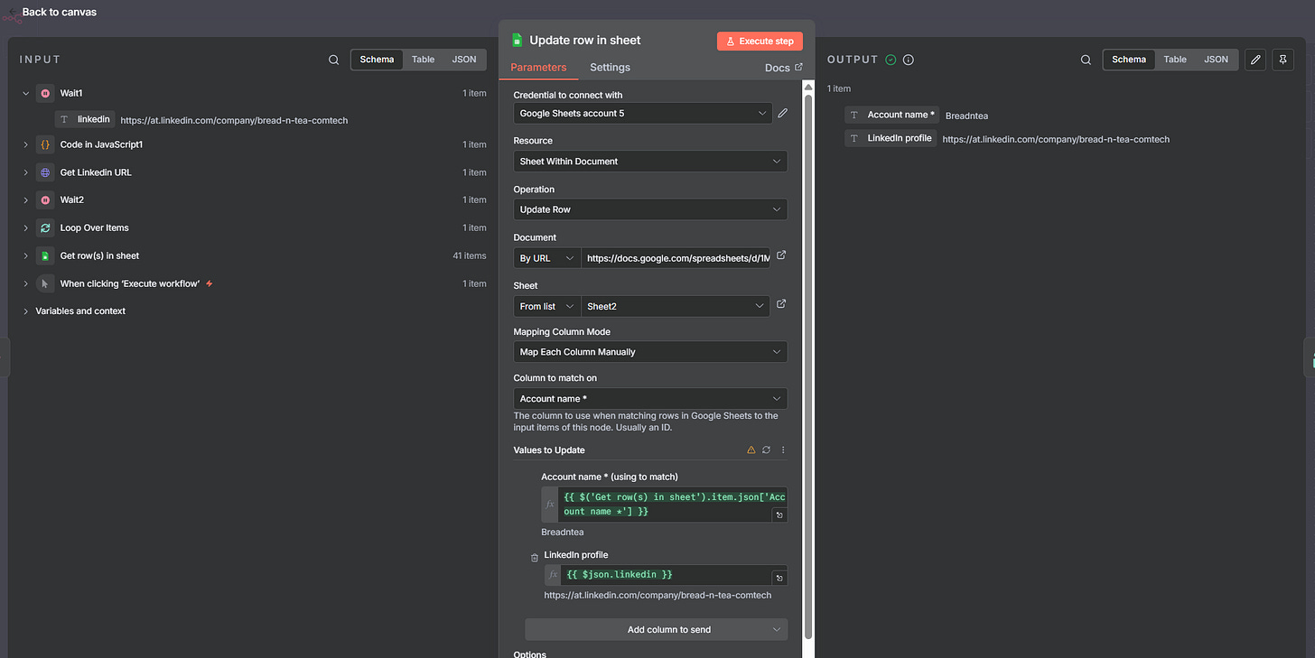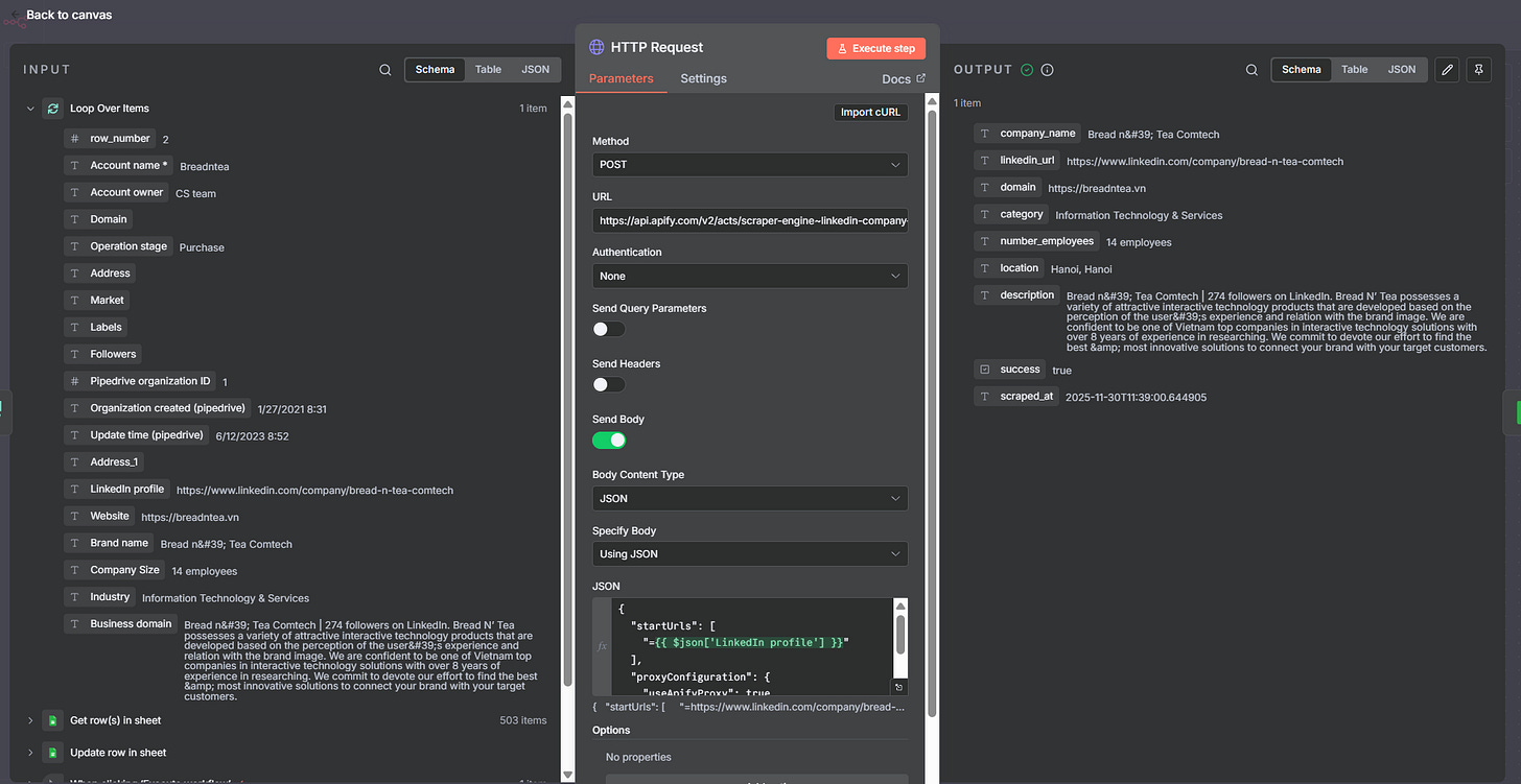 Sau khi Workflow 1 đã tìm ra đúng URL LinkedIn Company Page cho mỗi doanh nghiệp, bước tiếp theo rất đơn giản: