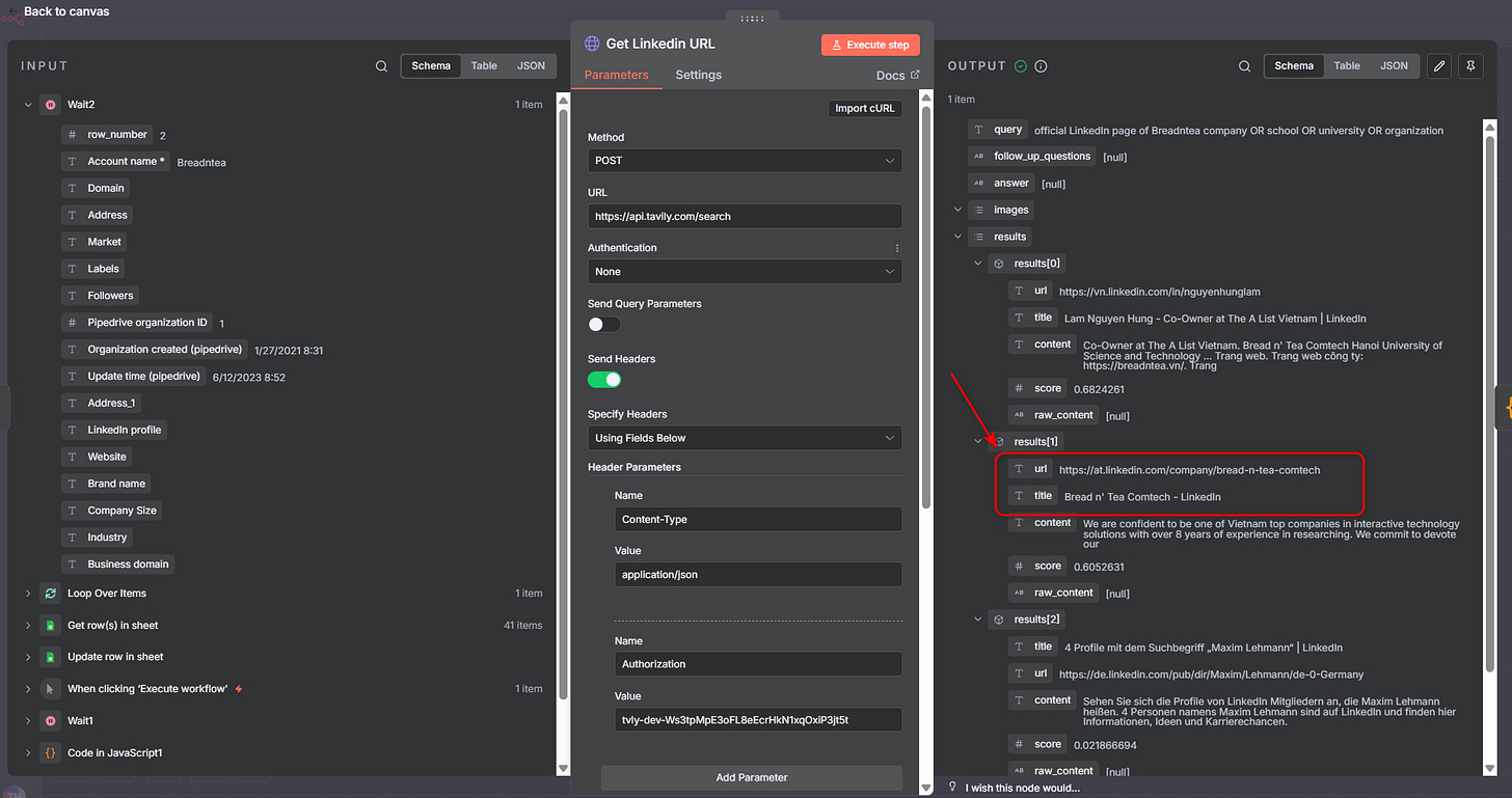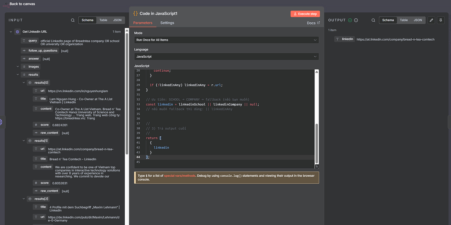 Lưu ý: Có một số công ty sẽ không có LinkedIn, nên kết quả Tavily trả về có thể sẽ ra sai, nên sau bước 1 sẽ cần rà qua 1 lướt các link. Nếu cái nào sai thì nên bỏ đi để không ảnh hưởng đến workflow 2.