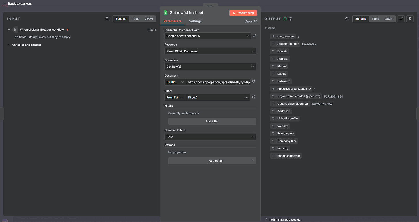 Mình dùng node Get row(s) in sheet để lấy toàn bộ danh sách LinkedIn URL mà Workflow 1 vừa tạo.