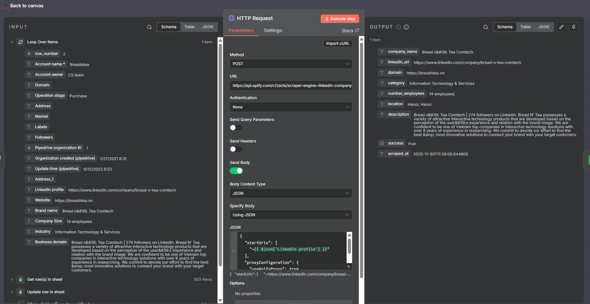 Mình dùng node HTTP Request để gọi API của Apify LinkedIn Company Profile Scraper.