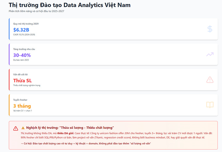 - Investment Climate: Is the market becoming saturated or is it still in the growth phase? List 3-5 factors justifying the investment potential over the next 3 years."Identify the most prominent market gaps and opportunities for a new Data Analyst training brand in Vietnam. Compare existing options such as international certifications (Google/Coursera), local bootcamps (e.g., MindX, CoderSchool), and traditional universities.