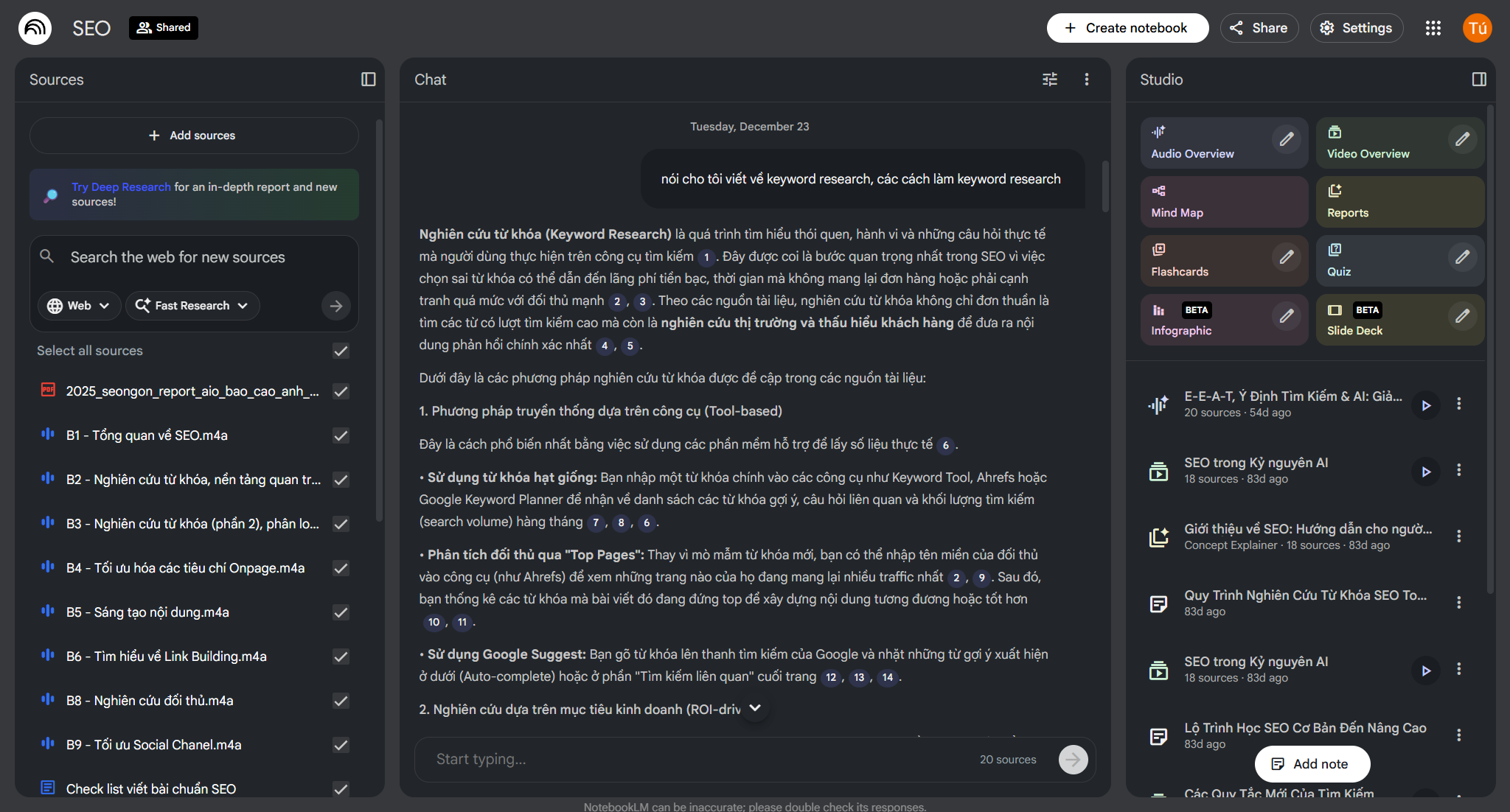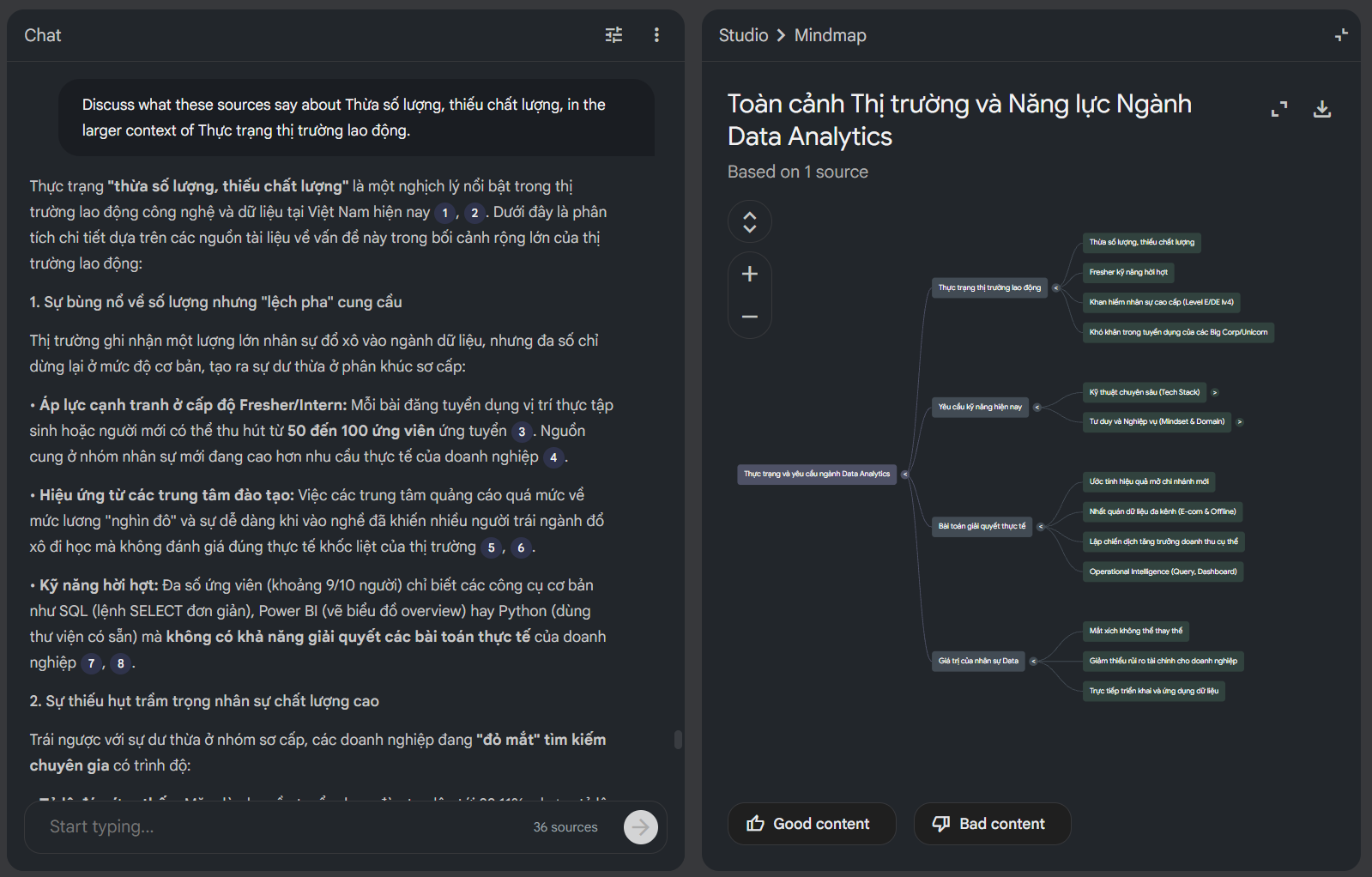Ở đây mình sử dụng tính năng của NotebookLM ở bên phải. Phần này khá hay bạn có thể vọc thử nha ^^