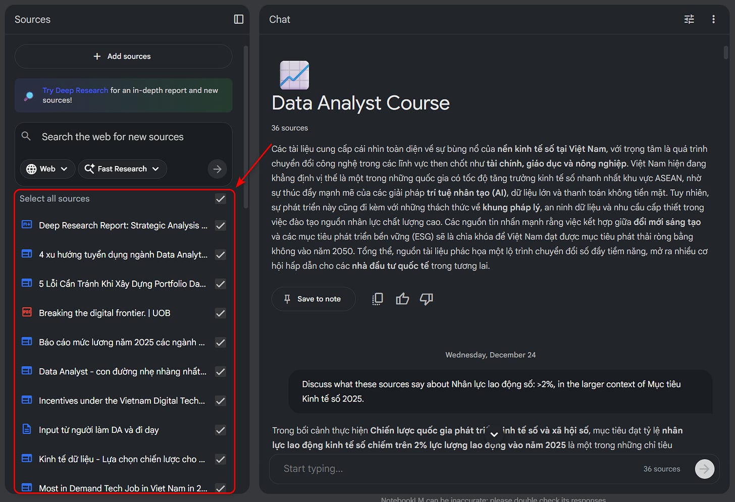 Điểm khác biệt lớn nhất của NotebookLM so với ChatGPT hay các Large Language Models (LLMs) chỉ suy luận từ những gì bạn đưa vào. Chình vì đặc tính này mà mình thấy nó sẽ cực kỳ phù hợp cho việc làm market research cần sự công tâm ^^ chứ đưa ChatGPT khéo nó lại bịa ra một đống ^^