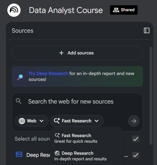 Sau đó mình sử dụng tính năng research trên chính NotebookLM để search những tài liệu liên quan.