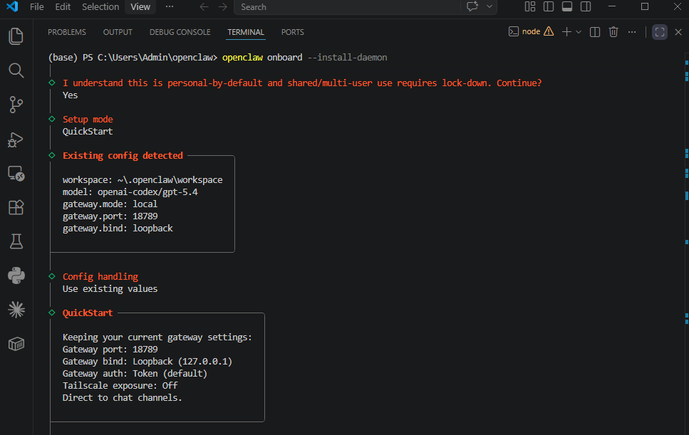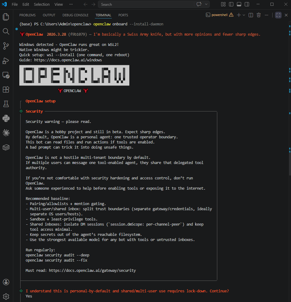 openclaw onboard --install-daemonĐến đây bạn sẽ thấy thông tin về OpenClaw & thông tin về Security warning.