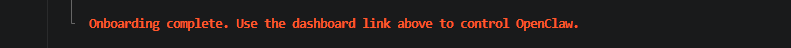 Sau khi hiện thông báo: “Onboarding complete. Use the dashboard link above to control OpenClaw.” là bạn đã thành công rồi đó.
