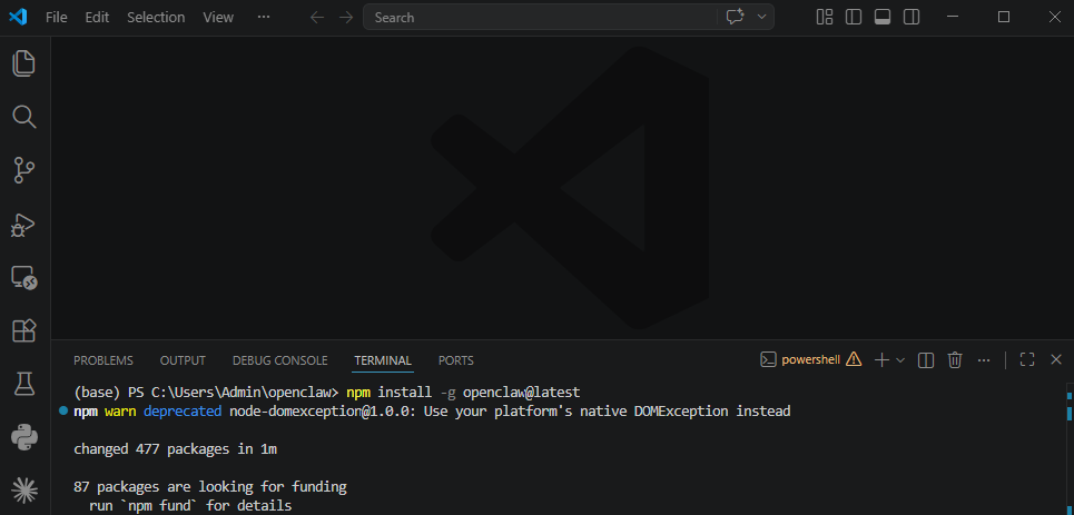 Để cài rất đơn giản bạn mở terminal (mình sử dụng Visual Studio Code) và chạy lệnh dưới đây: