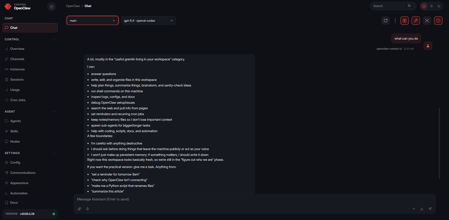 Trong phần onboard mình đã setup Telegram là channel chính và từ này mình sẽ có thể sai OpenClaw làm đủ trò mà chẳng cần phải đụng vào Desktop nữa.
