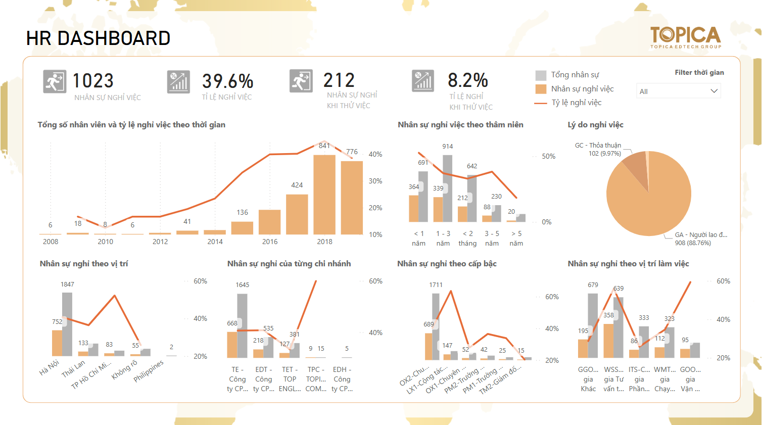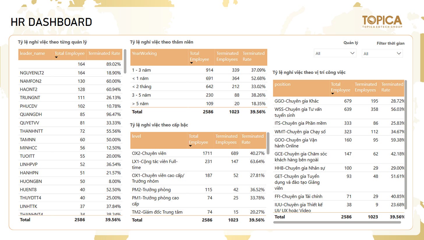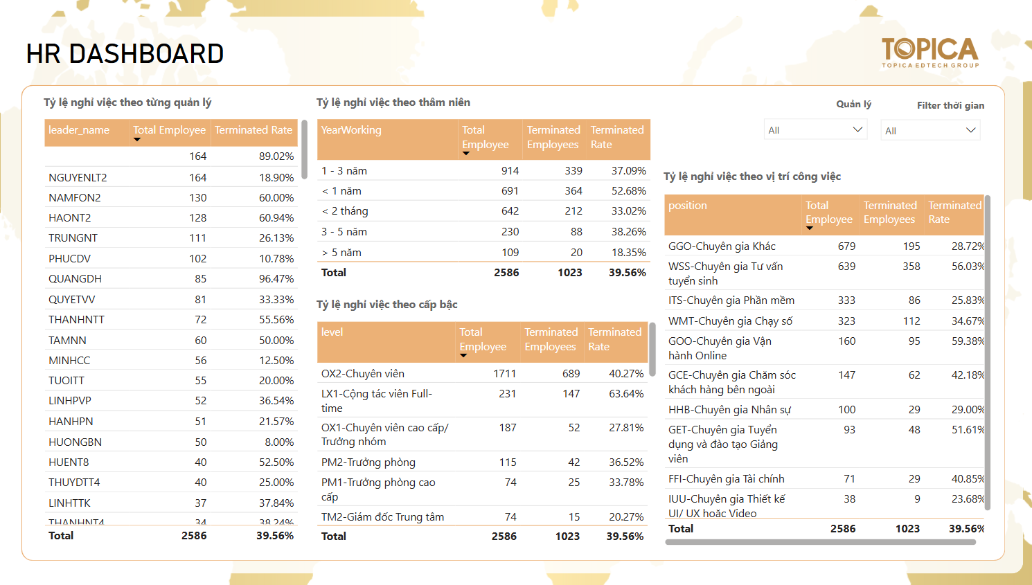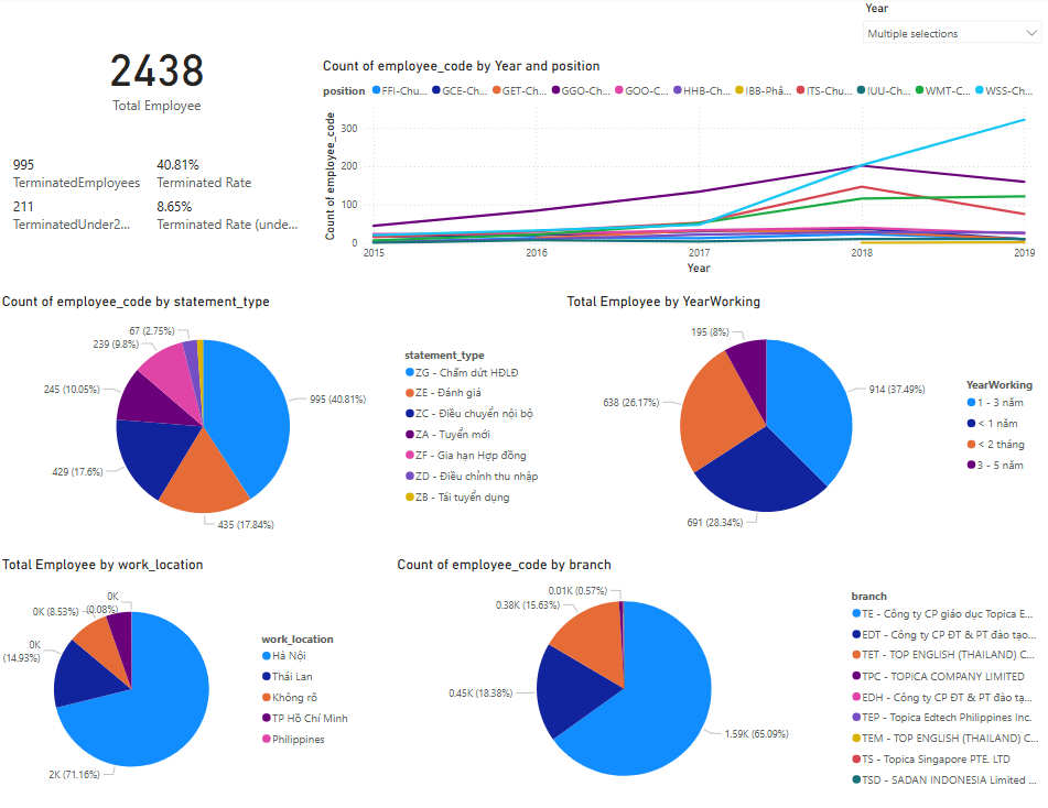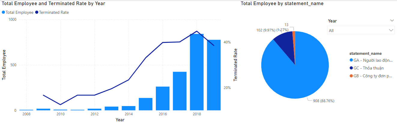 Terminated Rate (under 2 month) = DIVIDE([TerminatedUnder2Months],[Total Employee])Bước 3. Trực quan hóa dữ liệu & Đọc số để tìm kiếm Insights