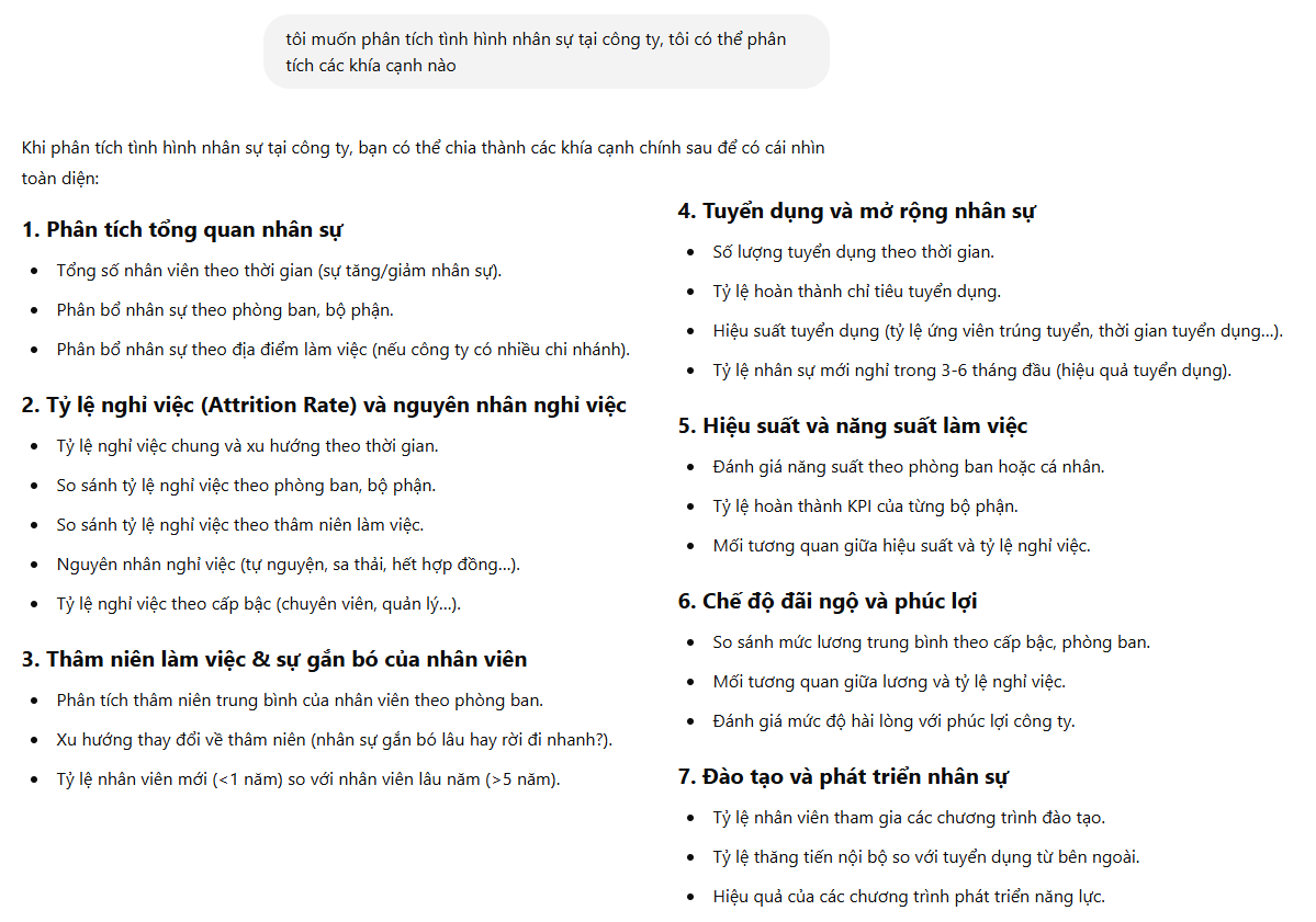 Vì mình không có bất cứ kinh nghiệm gì trong mảng nhân sự cả, nên trước hết mình sẽ cần phải tìm hiểu xem đối với một bài toán phân tích về tình hình nhân sự mình có thể khai thác các khía cạnh nào. Bạn có thể dựa vào hiểu biết cá nhân, hỏi bạn bè làm trong mảng nhân sự, tìm kiếm trên Google,… ở đây mình tận dụng luôn ChatGPT vì nó có khả năng tổng hợp thông tin khá tốt.