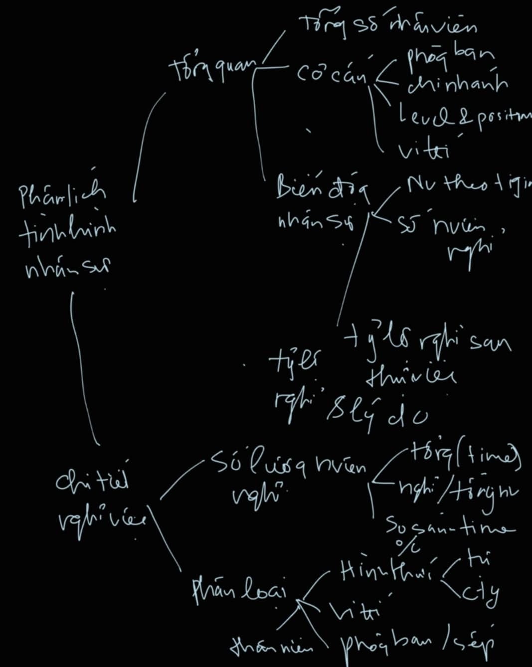 Sau đó mình vẽ mindmap chi tiết để xác định rõ hơn phần tổng quan mình sẽ đi phân tích những gì, phần chi tiết tình hình nghỉ việc của nhân sự sẽ đi phân tích những gì. Bước này vừa là để mình có định hướng rõ ràng hơn cho phần phân tích, vừa là outline để mình thiết kế dashboard sau này.