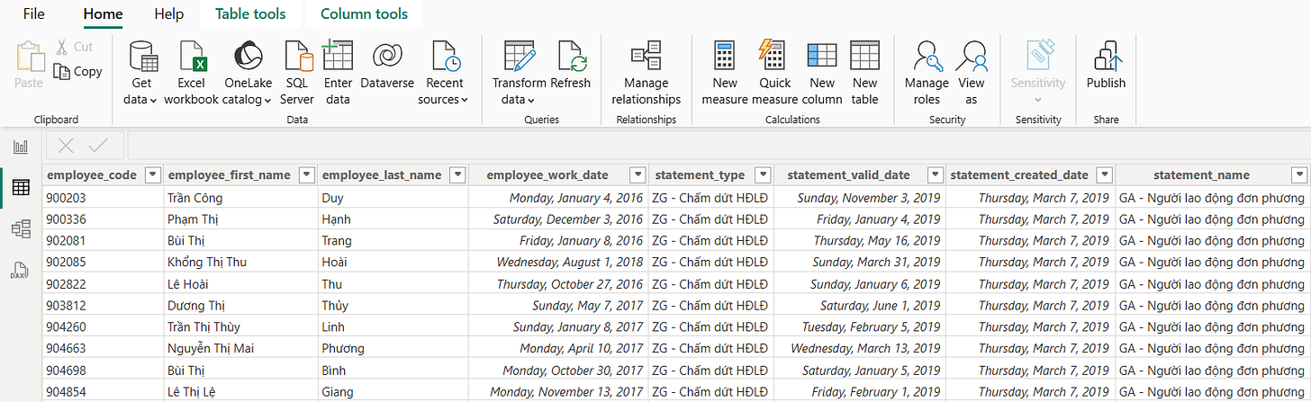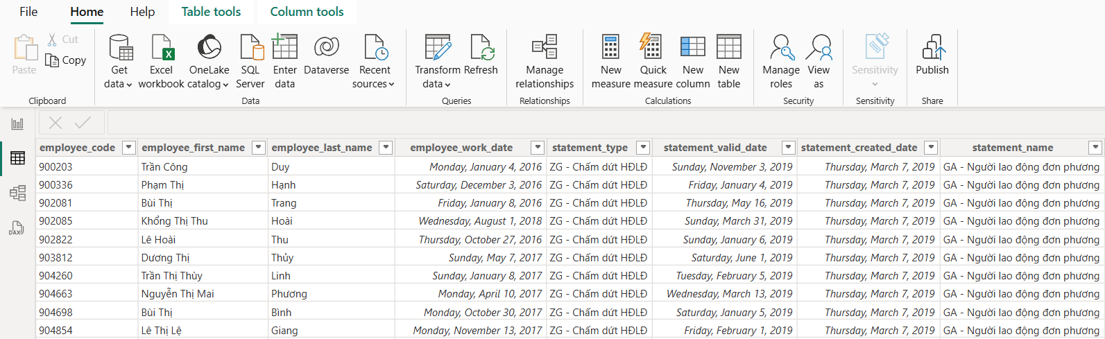 Ở project này mình sử dụng Power BI để trực quan hóa dữ liệu. Mình tiến hành import file Data vào và được kết quả như hình dưới đây: